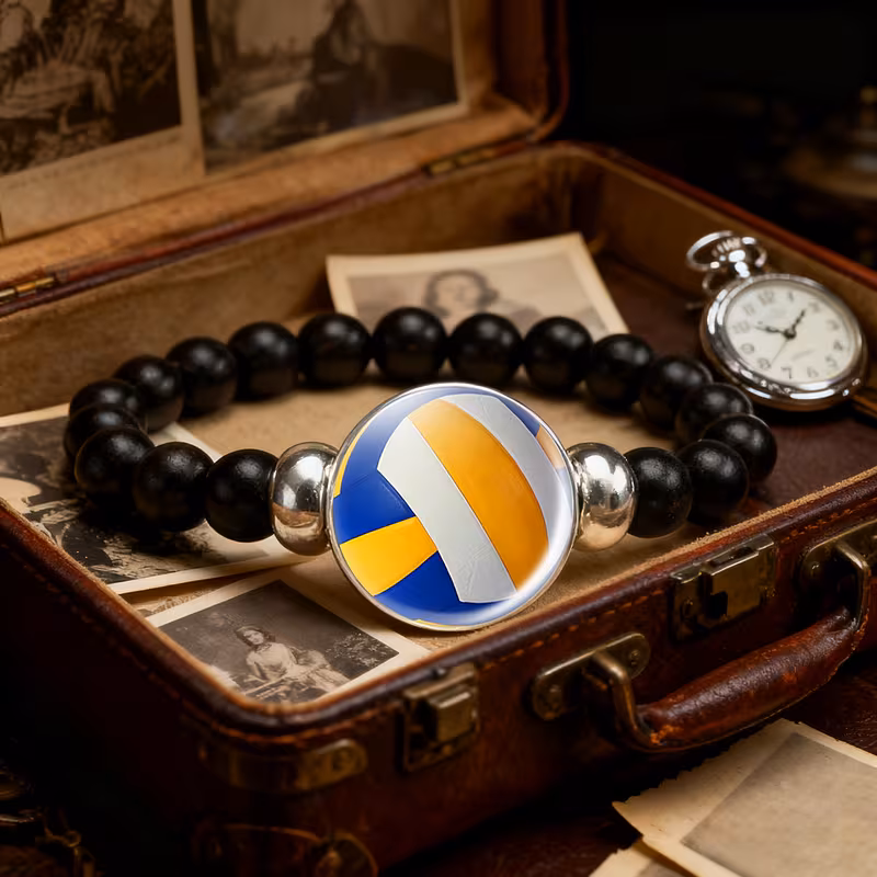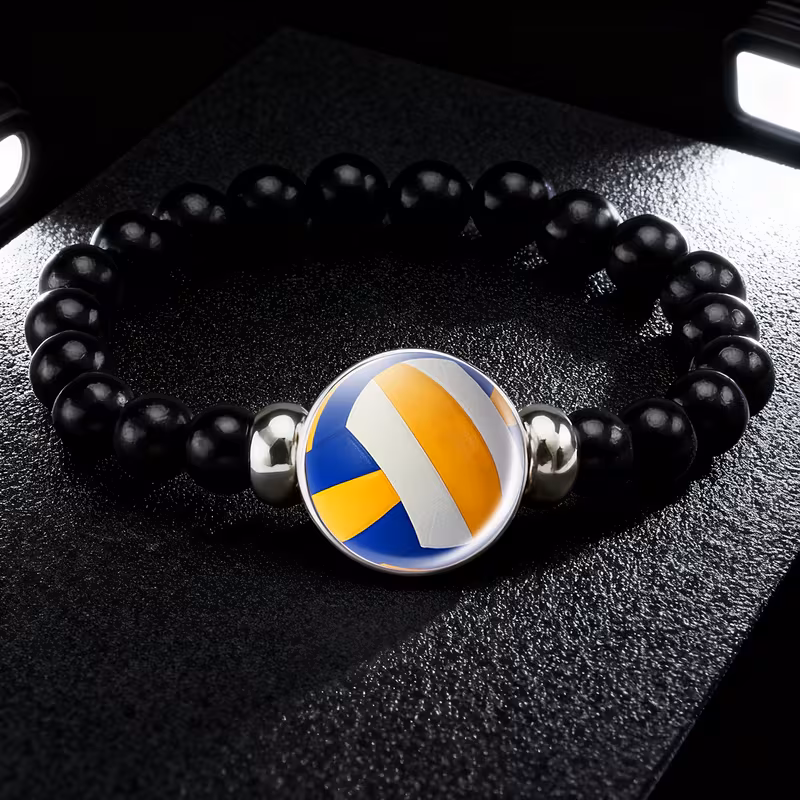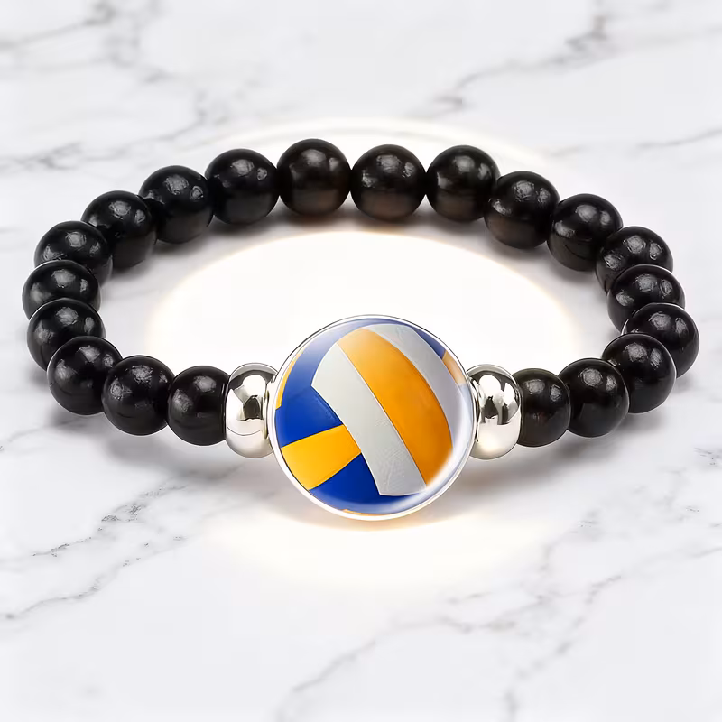 سوار أنيق من الجلد الصناعي الأسود مزين بتصميم كرة الطائرة بألوان الأزرق والأصفر والأبيض. تصميم متين وبسيط، مثالي للمنافسات الرياضية والتدريب، يضيف لمسة رياضية أنيقة للمظهر اليومي.
